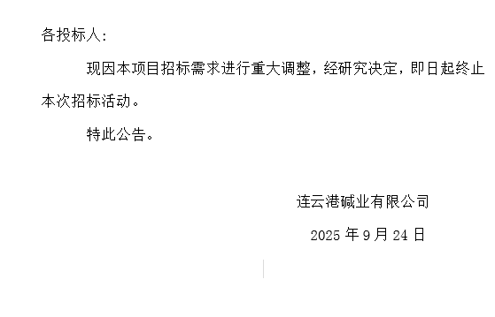 關(guān)于連云港堿業(yè)有限公司化工輔料甲醇采購(gòu)終止招標(biāo)的公告
