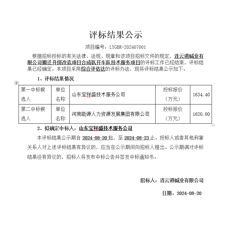 搬遷升級改造項目合成氨開車隊技術(shù)服務(wù)項目評標結(jié)果公示