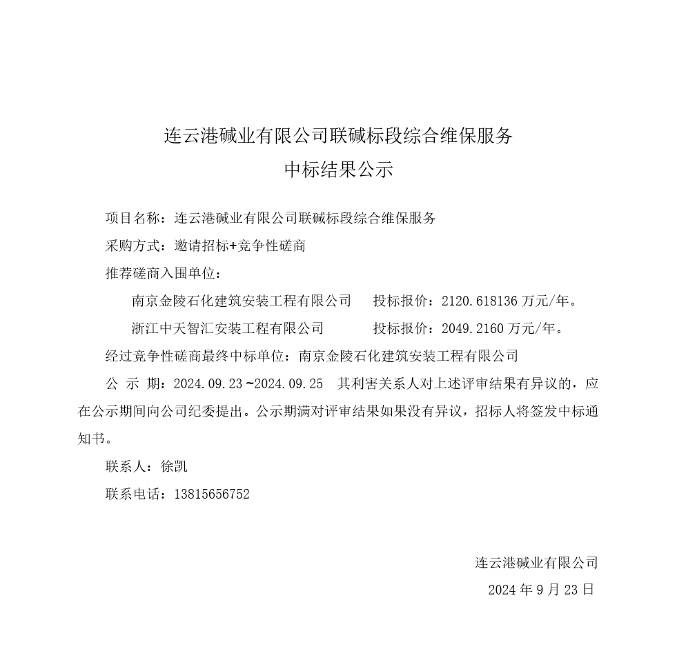 聯(lián)堿標(biāo)段綜合維保服務(wù)中標(biāo)結(jié)果公示
